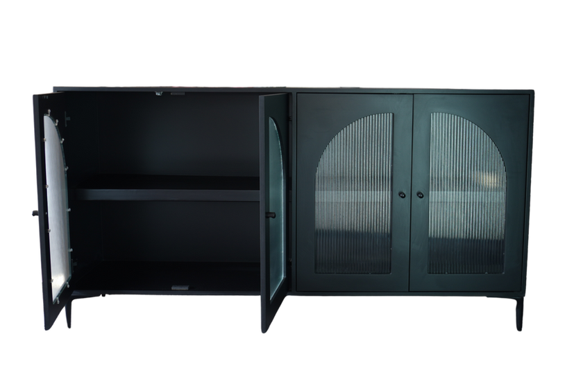 The Stanley Server is crafted in Cape Town with a wooden frame, designed for both durability and refined appeal. Its four arched fluted glass doors conceal generous storage space, while the flat top surface offers room for display or serving. Slim raised legs keep the design light and elevated, making it easy to place within any room. Each Stanley Server can be customised in your preferred stain, finish, and hardware to suit your space. Versatile and timeless, it works beautifully in both residential and professional interiors.